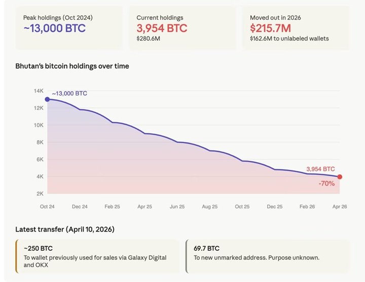 Bhutan stopniowo wycofuje się z inwestycji w Bitcoina. W ciągu ostatnich 18 miesięcy kraj sprzedał około 70% swoich zasobów tej kryptowaluty. Jeszcze w październiku 2024 roku Bhutan posiadał około 13 000 BTC, a dziś zostało mu mniej niż 4 000. Obecna wartość tych rezerw to około 280 milionów dolarów.