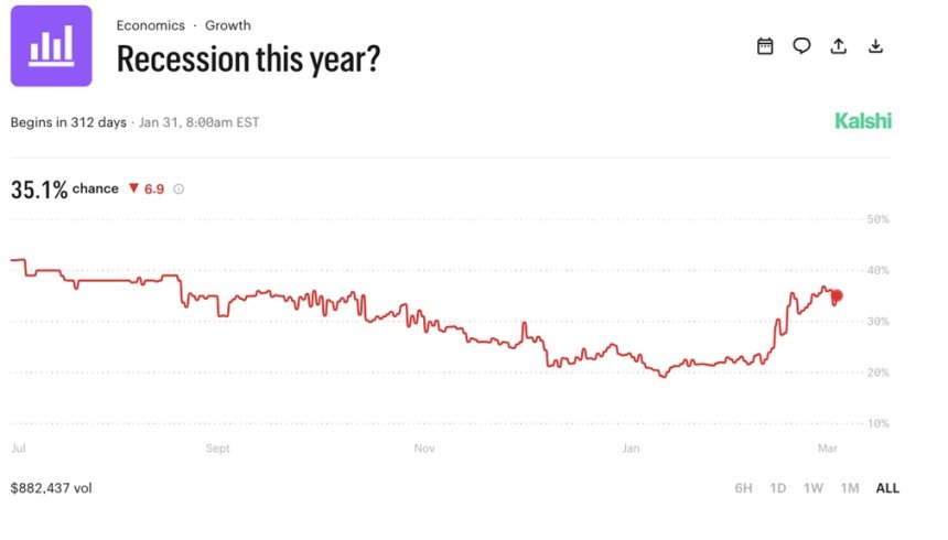 Według Moody’s Analytics prawdopodobieństwo recesji w ciągu najbliższych 12 miesięcy wynosi już 48,6%. Z kolei Goldman Sachs ocenia je na 30%. Również rynek prognoz wskazuje na rosnące ryzyko, które sięga obecnie 35% i jest najwyższe od września 2025 roku.