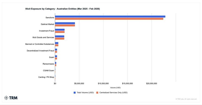 Nielegalna aktywność związana z kryptowalutami w Australii stanowi bardzo niewielką część całego rynku. Z analizy firmy TRM Labs wynika, że mniej niż 1% wszystkich transakcji on chain między marcem 2025 a lutym 2026 było powiązanych z nielegalnymi podmiotami. Oznacza to, że zdecydowana większość operacji w ekosystemie kryptowalut odbywa się w legalnych celach finansowych i biznesowych.