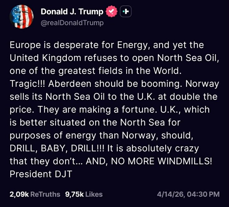 Prezydent Donald J. Trump na swojej platformie Truth Social skrytykował Wielką Brytanię, odnosząc się do jej polityki energetycznej. W swoim wpisie zwrócił uwagę na sytuację w Europie, która jego zdaniem zmaga się z problemami w dostępie do energii.